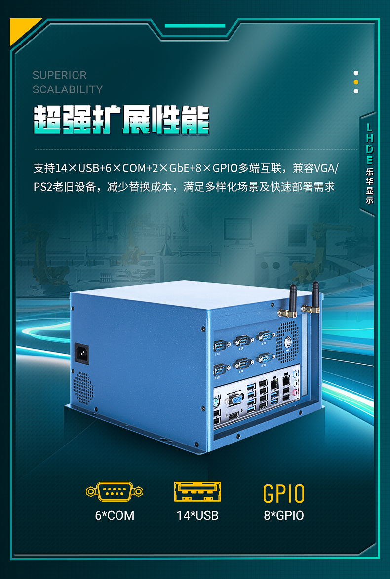 接口部分支持14×USB+6×COM+2×GbE+8×GPIO多端互聯(lián),兼容VGA/PS2老舊設(shè)備,滿足多樣化場(chǎng)景及快速部署需求。